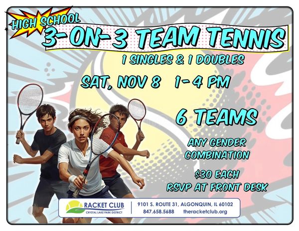 What a fun & interesting format! High schoolers, get your teams of three together (can be any combination of genders) and play in this round robin afternoon tournament. Teams will face off in one singles, one doubles configurations (so two courts per matchup) and then rotate opponents every half-hour. It's all about match experience and hey, braggin' rights are always fun too 🙌