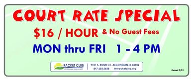 Open court time reservations may be made one week in advance by members and one day in advance by non-members (with $11/resident or $14/non-resident additional guest fees). Play begins on the hour and half hour; $26/hour rental fee. Call 847-658-5688 or stop by the front desk to make a reservation.