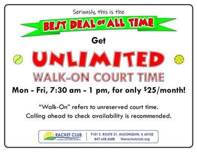 If your lifestyle features occasional gaps in the schedule that can be filled with a quick session, we don't see how you could do better than this deal! Add this to your membership for only $25/month, and play as much and often as you like* just so long as you don't make a reservation. (We suggest calling first to make sure there are available courts.) Month-to-month commitment; can be cancelled at any time.